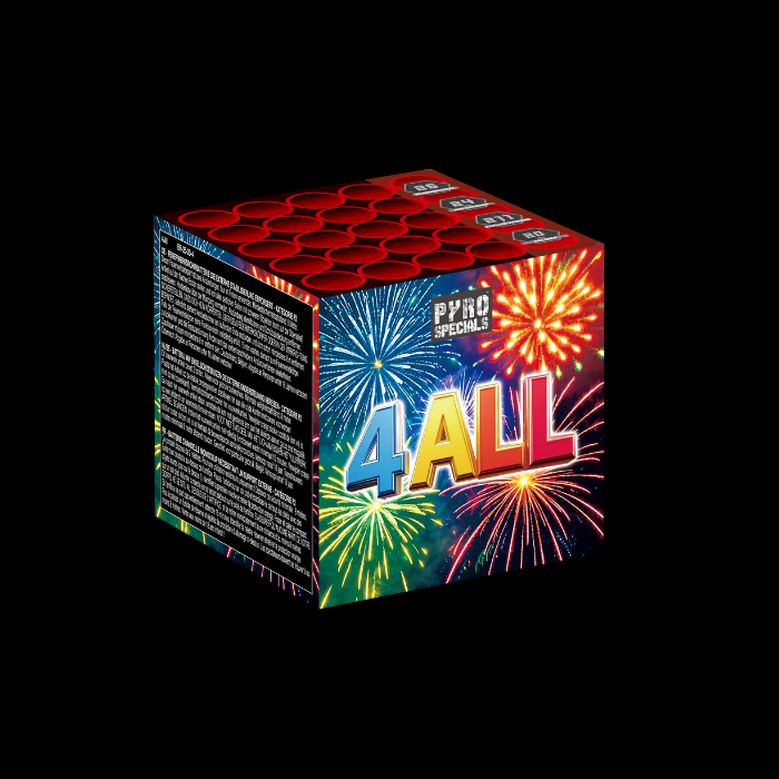💥 4 ALL (ER-25-20-4) 25 Schuss | Kaliber 20 mm | NEM: 211 g | Kategorie F2 | Klassifizierung: 1.4G Verpackungseinheit (VE): 12/1 4 ALL überzeugt mit 25 leuchtstarken Schuss im 20 mm Kaliber. Intensive Farben und dynamische Blinkeffekte sorgen für ein abwechslungsreiches Bild – kompakt, präzise und für jeden Feuerwerksliebhaber geeignet.
